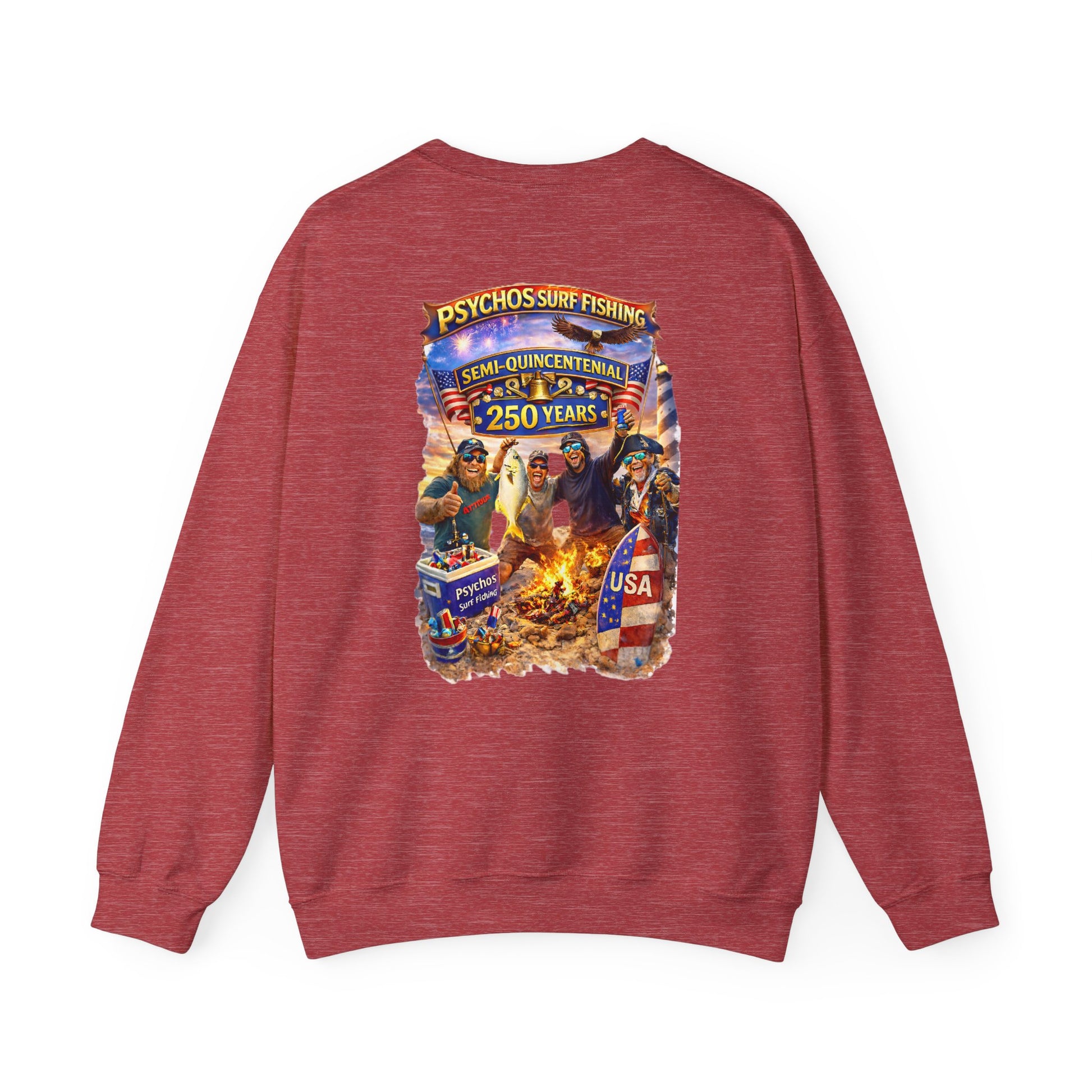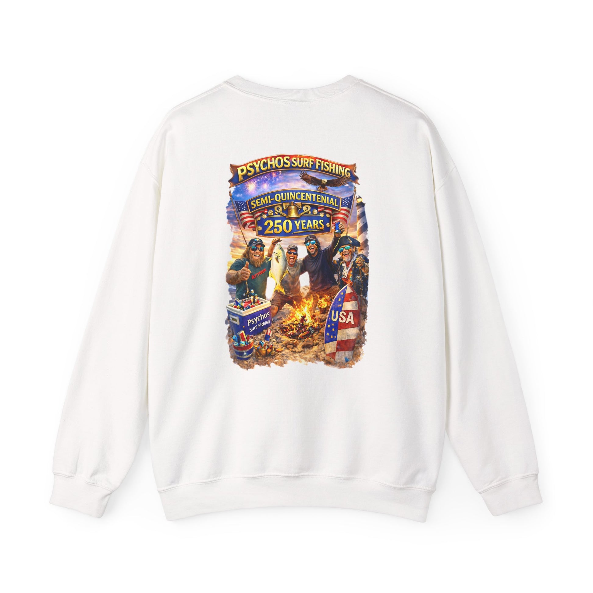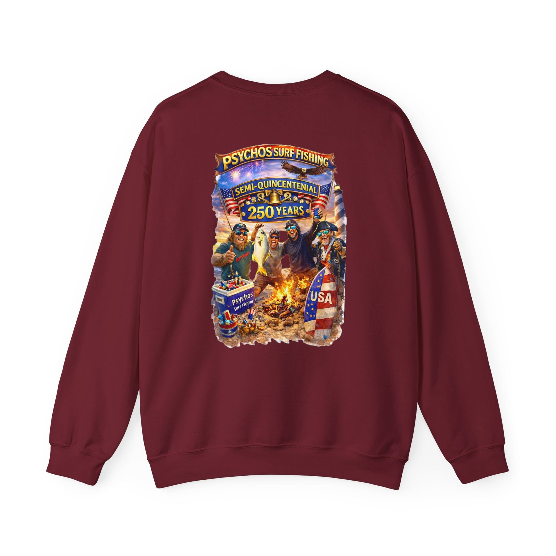Semi-Quincennial 250 Years Crewneck Sweatshirt — Psychos Surf Fishing Retro USA Design